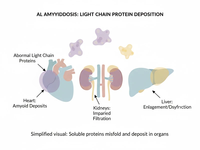 AL amyloidosis is a serious but increasingly treatable condition. It occurs when abnormal plasma cells in the bone marrow produce misfolded proteins known as light chains. These proteins circulate in the bloodstream and deposit in vital organs, where they gradually interfere with normal organ function. Over time, this can affect the heart, kidneys, liver, nervous system and digestive tract.